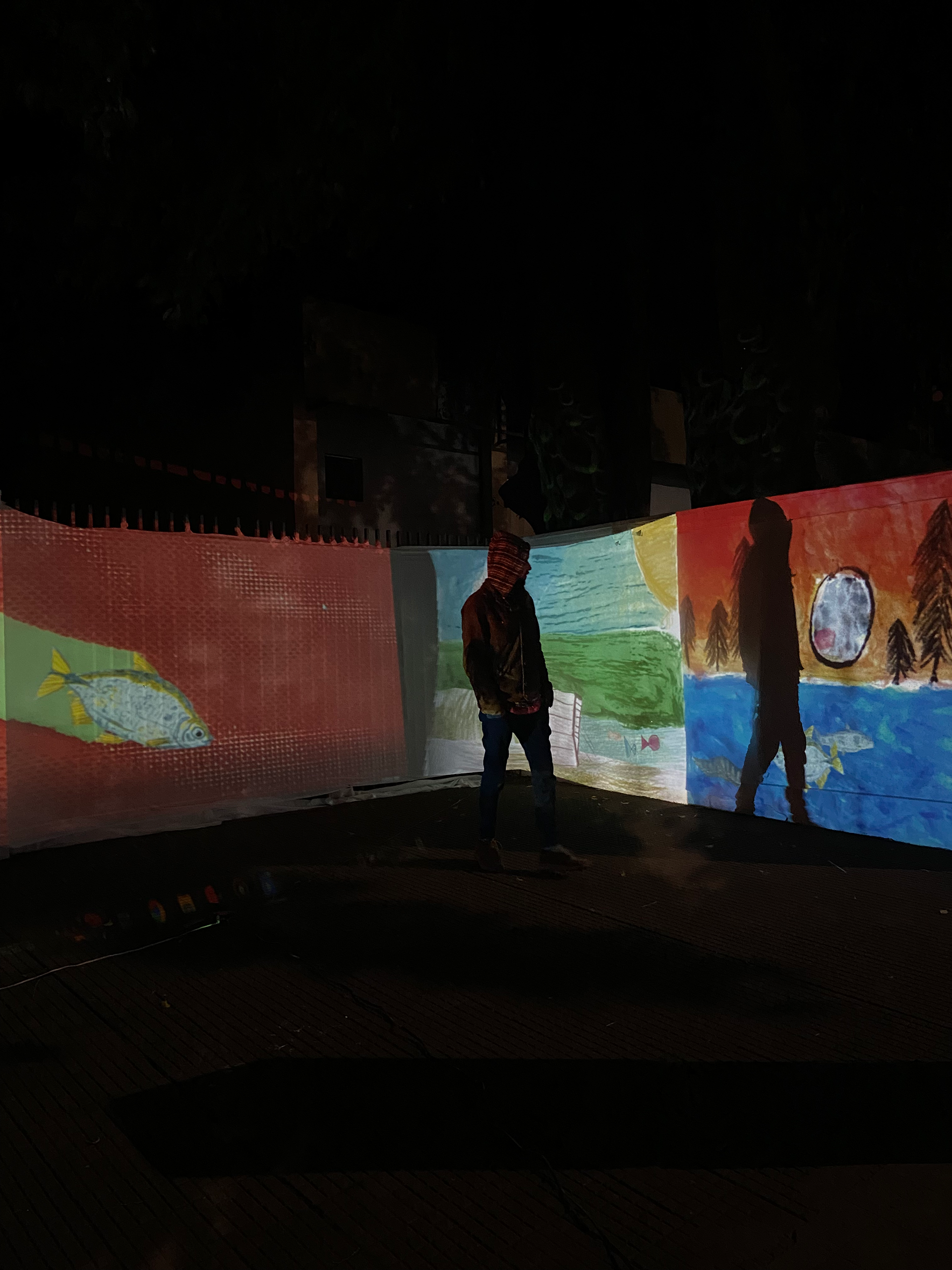 Projeção mapeada realizada em 2021, em parceria com o artista convidado João Penna, na ocasião de abertura da intervenção artística no jardim da Biblioteca Municipal Tristão de Athayde, na cidade de Ourinhos (SP).
